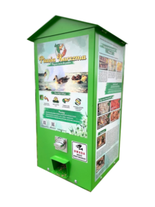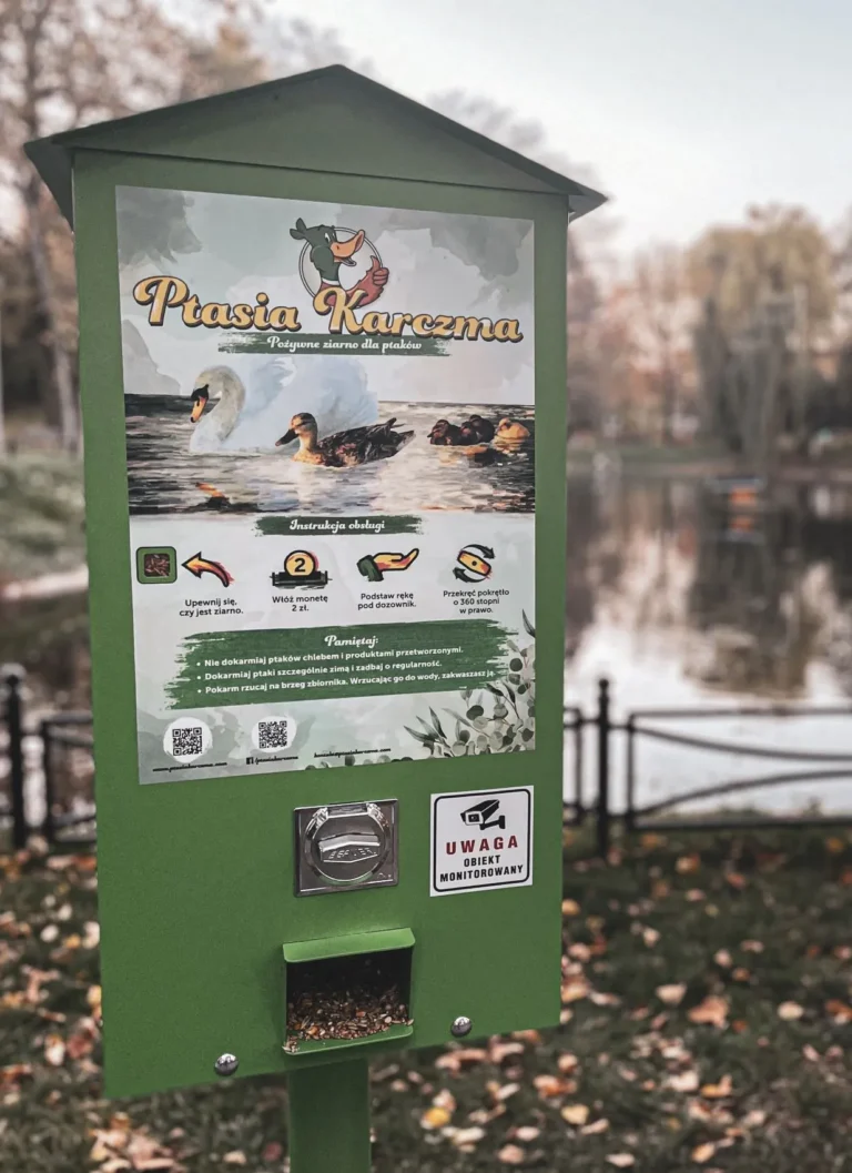 Ptasia Karczma to kolorowa metalowa budka, na której znajdziemy instrukcję obsługi, informację czym można, a czym nie wolno dokarmiać ptaków oraz dużo ciekawostek o różnych gatunkach. Jeżeli chcesz skorzystać z urządzenia, wystarczy wrzucić 2zł do wrzutnika i przekręcić pokrętło. Urządzenie jest w pełni mechaniczne i wydaje porcję zdrowego ziarna dla ptaków.